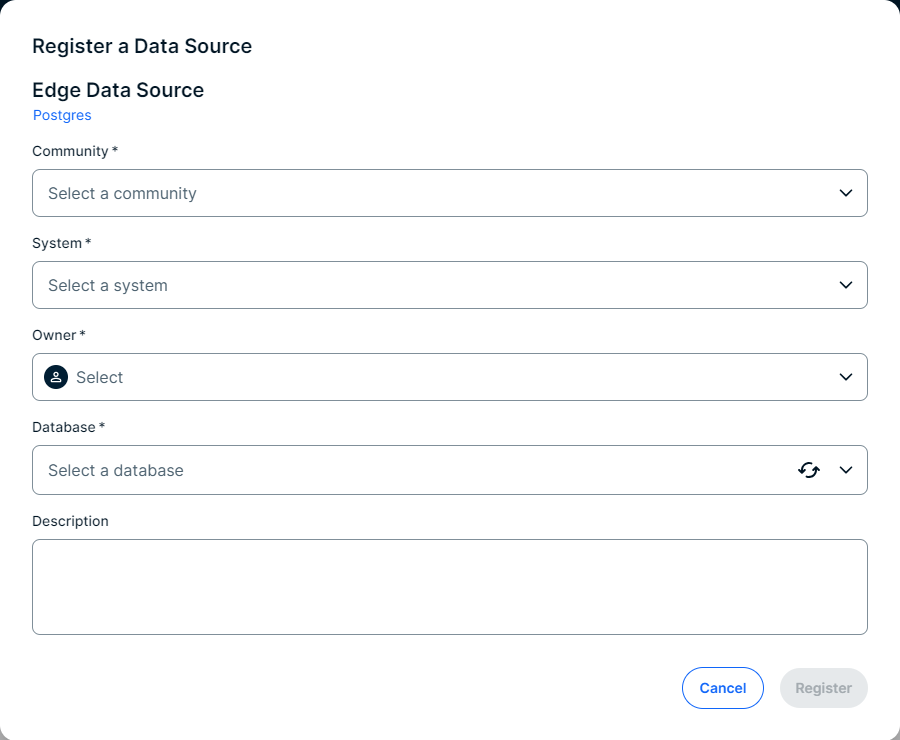 The name will also be the name of the Database asset that is created as a result of registering the data source via Edge. Important