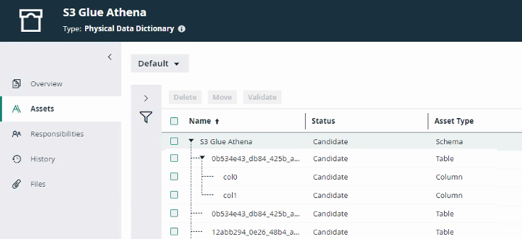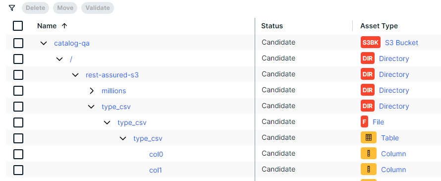 If you integrate an Amazon S3 file system, the resulting assets represent the Amazon S3 folder structure by means of Amazon S3 Bucket, Directory, File, Table, and Column assets. Note that you can’t profile and classify the columns and tables. |