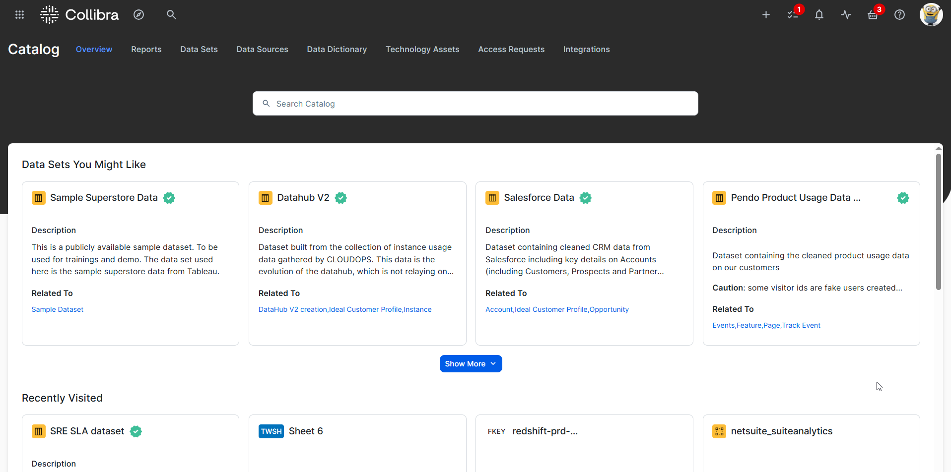 When you click Catalog in the application menu, the Data Catalog Overview page opens. This page is designed to help you quickly and easily find Data Catalog-related assets.