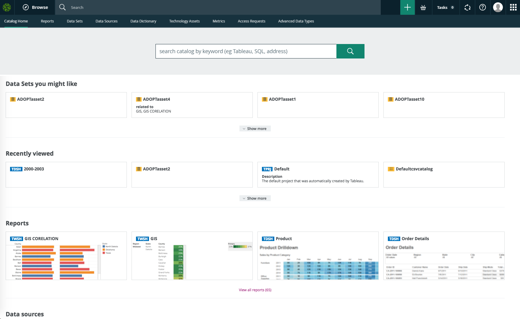The Data Catalog Home is the landing page when you open the Catalog application. This page is designed to help you quickly and easily find Data Catalog-related assets.