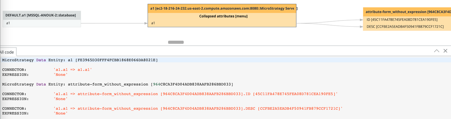 The technical lineage graph shows relations between BI assets and other data objects in the data flow, for example Column assets or MicroStrategy Data Attribute assets. These relations are created during the MicroStrategy ingestion process as a result of automatic stitching.