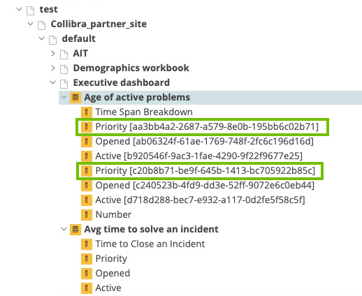 In the following example image, the names of the assets Priority, Opened and Active in the technical lineage have been appended with their UUIDs.
