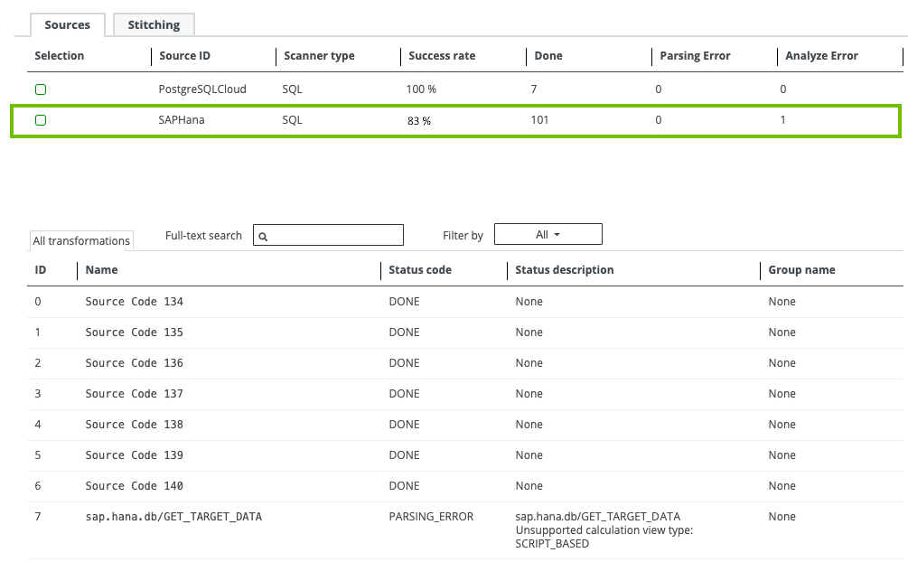 For example, the following image shows that you have created a technical lineage for two data sources. SAP HANA has a success rate of 83%. When you use the transformation logs to investigate the errors, you see that the Collibra Data Lineage service instance couldn't process some elements of the SAP HANA metadata, for example because they are not supported or because there is an issue in the configuration file.