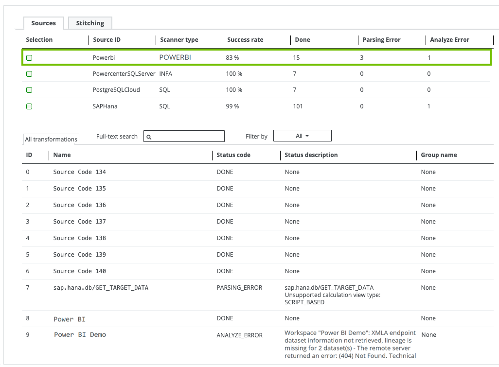 The following image shows that you have created a technical lineage for four data sources. Power BI has a success rate of 83%. When you use the transformation logs to investigate the errors, you see that the Collibra Data Lineage service instance couldn't process some elements of the Power BI metadata, for example because they are not supported or there is an issue in the configuration file or the Power BI setup.