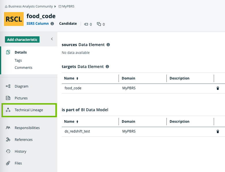 The Technical lineage tab is only shown if you have the Data Catalog global role with the Catalog and Technical lineageglobal permissions.