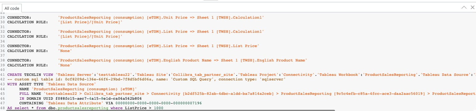 If you use custom SQL that is not supported by the Tableau metadata API, the technical lineage might not be complete. For complete information, see the Tableau documentation on Tableau Catalog support for custom SQL and Tableau Lineage and custom SQL connections.