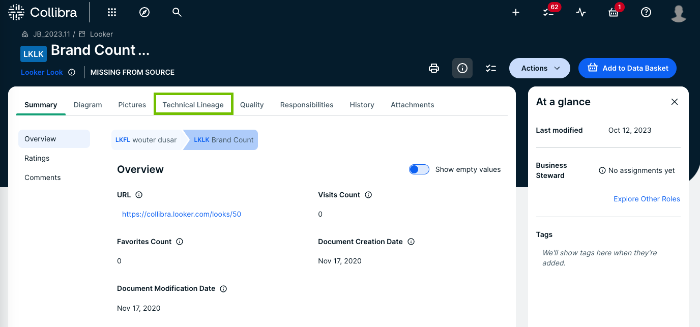 When you ingest Looker metadata, you automatically create a technical lineage for Looker Look assets. If you have the right permissions to view the technical lineage, you can go to a Looker Look asset page and click the Technical lineage tab, which allows you to access the technical lineage.