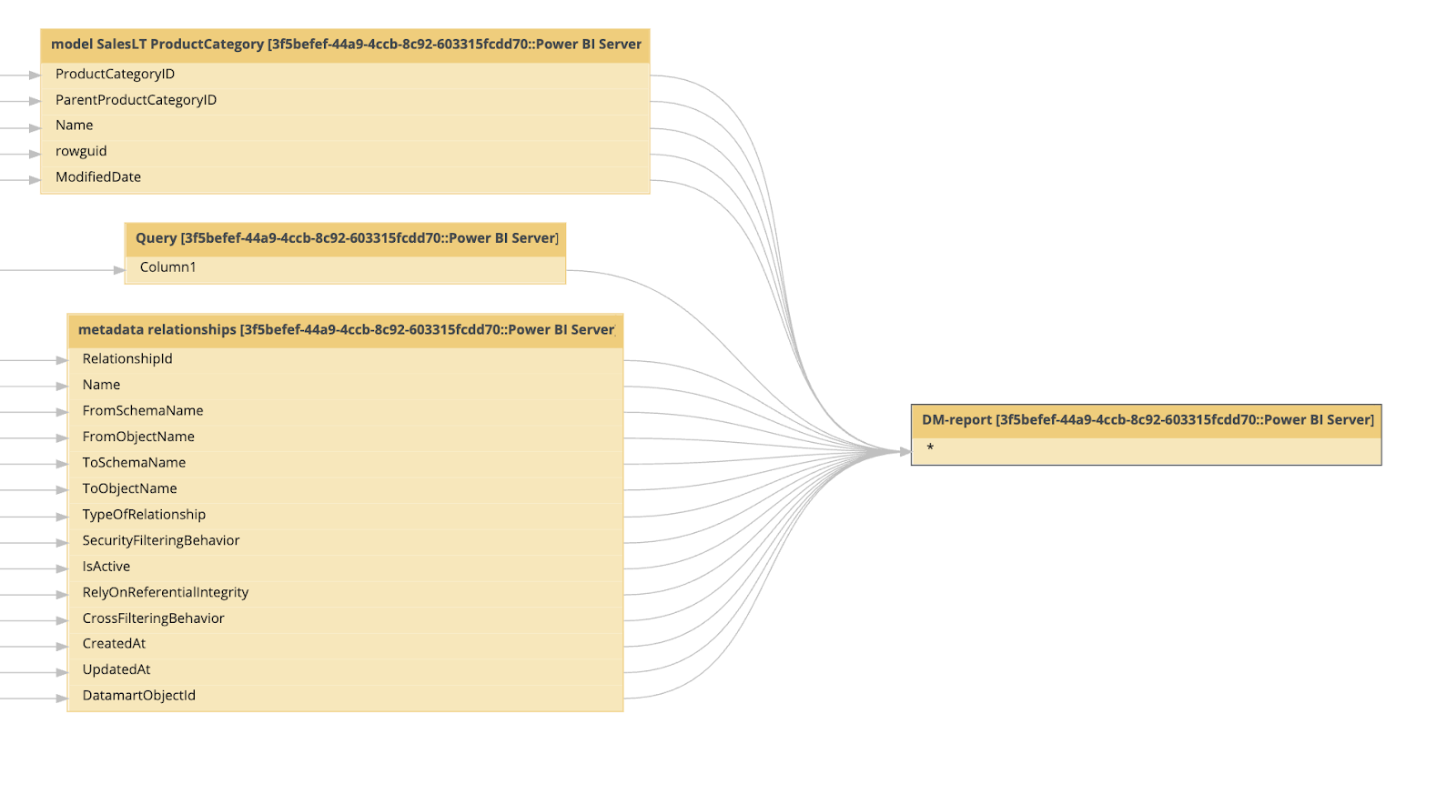 In the current release, technical lineage shows the direct flow from specific semantic model columns to the corresponding fields in a Power BI report.