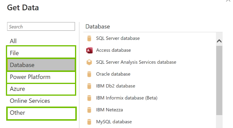 - All data source types under Database require a JDBC connection.