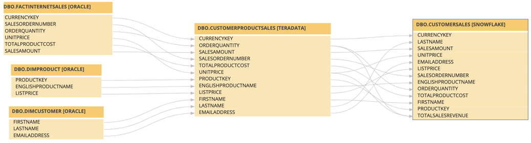 - Data objects from your data source that are stitched to assets in Data Catalog and for which you created the technical lineage. These assets have a yellow background. Example