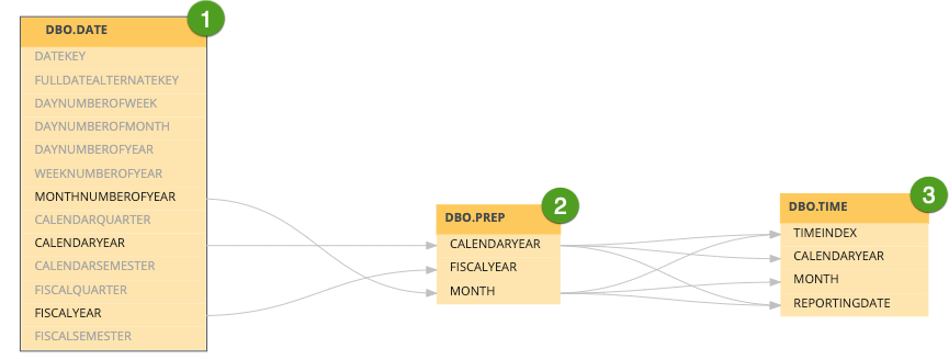 Since a technical lineage shows how data flows from source to destination, it is possible to see a lineage graph with yellow and gray nodes.