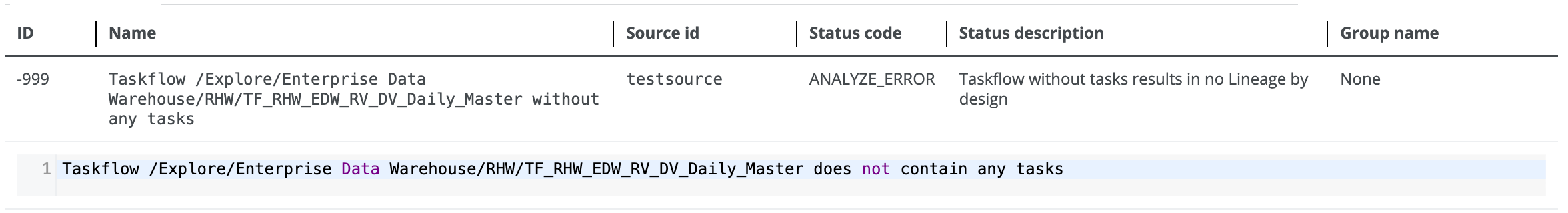 This error occurs when the indicated taskflow does not contain any tasks. No lineage is created for the taskflow. No action is required.
