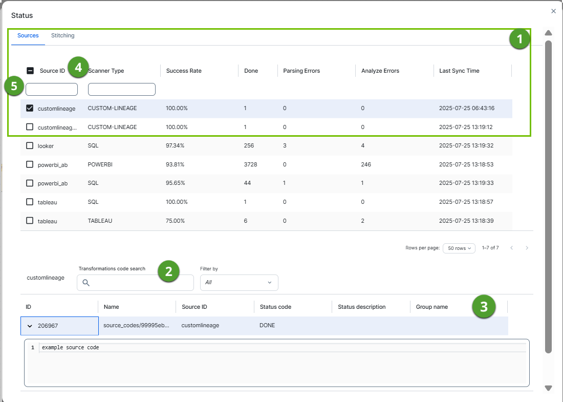 The table that contains details of the transformations and source code (fragments). You can filter the rows in the table by selecting data sources in the data source table and by using the search tools. Tip Click > next to the ID to view the source code or transformation details.