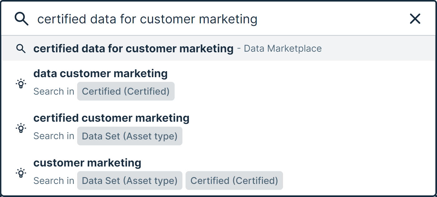 - The last suggestion provides the possibility to search for the terms customer marketing with the filter Certified set to Certified and the filter Asset Type set to Data Set. This suggestion type is not available in Data Marketplace in Search.