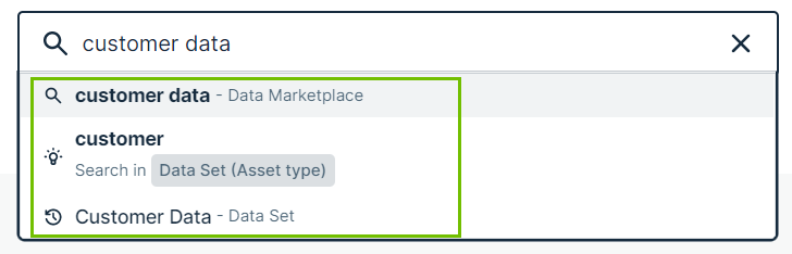 - The second suggestion provides the possibility to search for the terms customer with the filter Asset Type set to Data Attribute. This suggestion type is not available in Data Marketplace in Search.