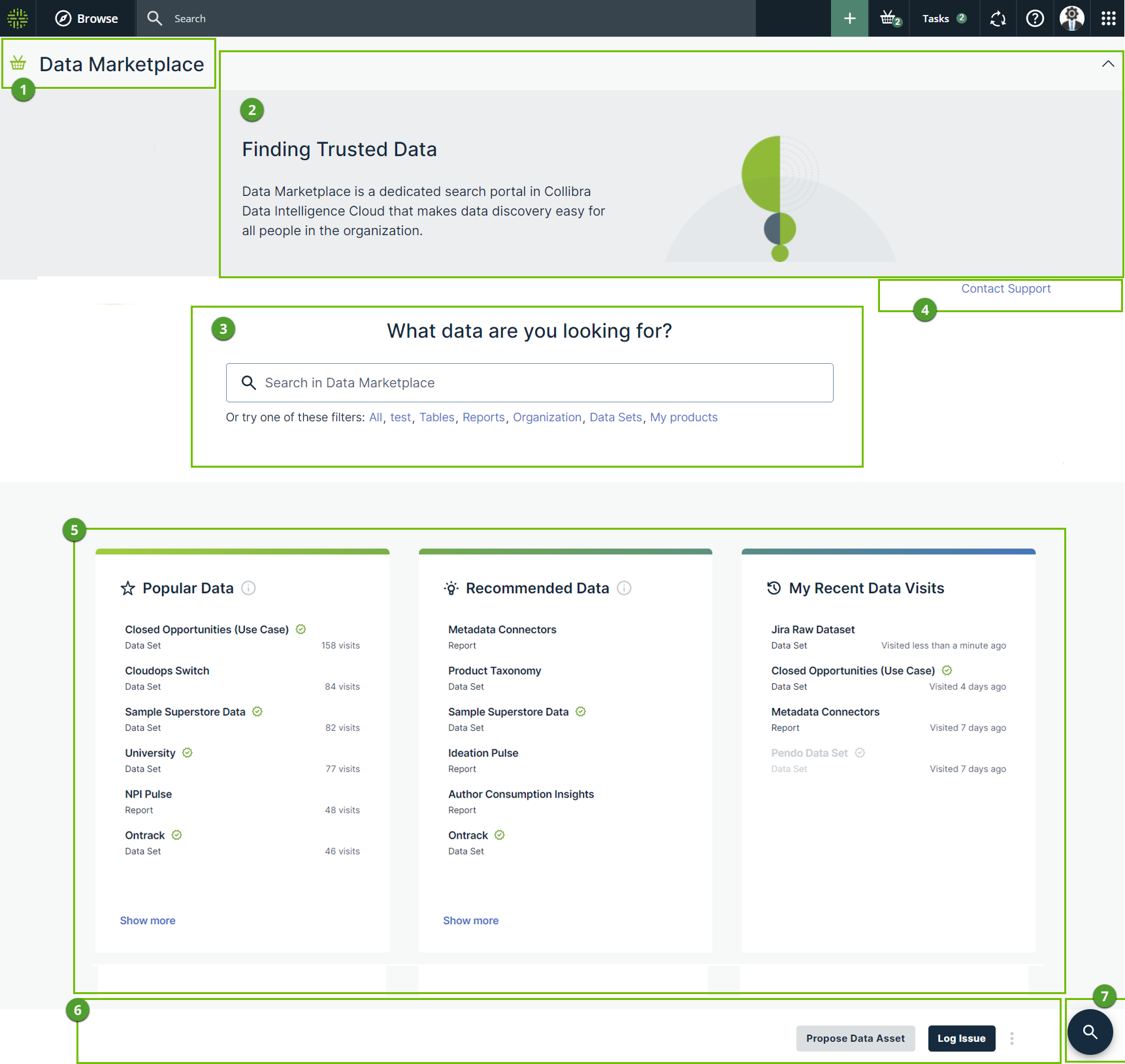 In Data Marketplace, as a data consumer, the landing page is your starting point to find the data you need. The page consists of multiple sections.