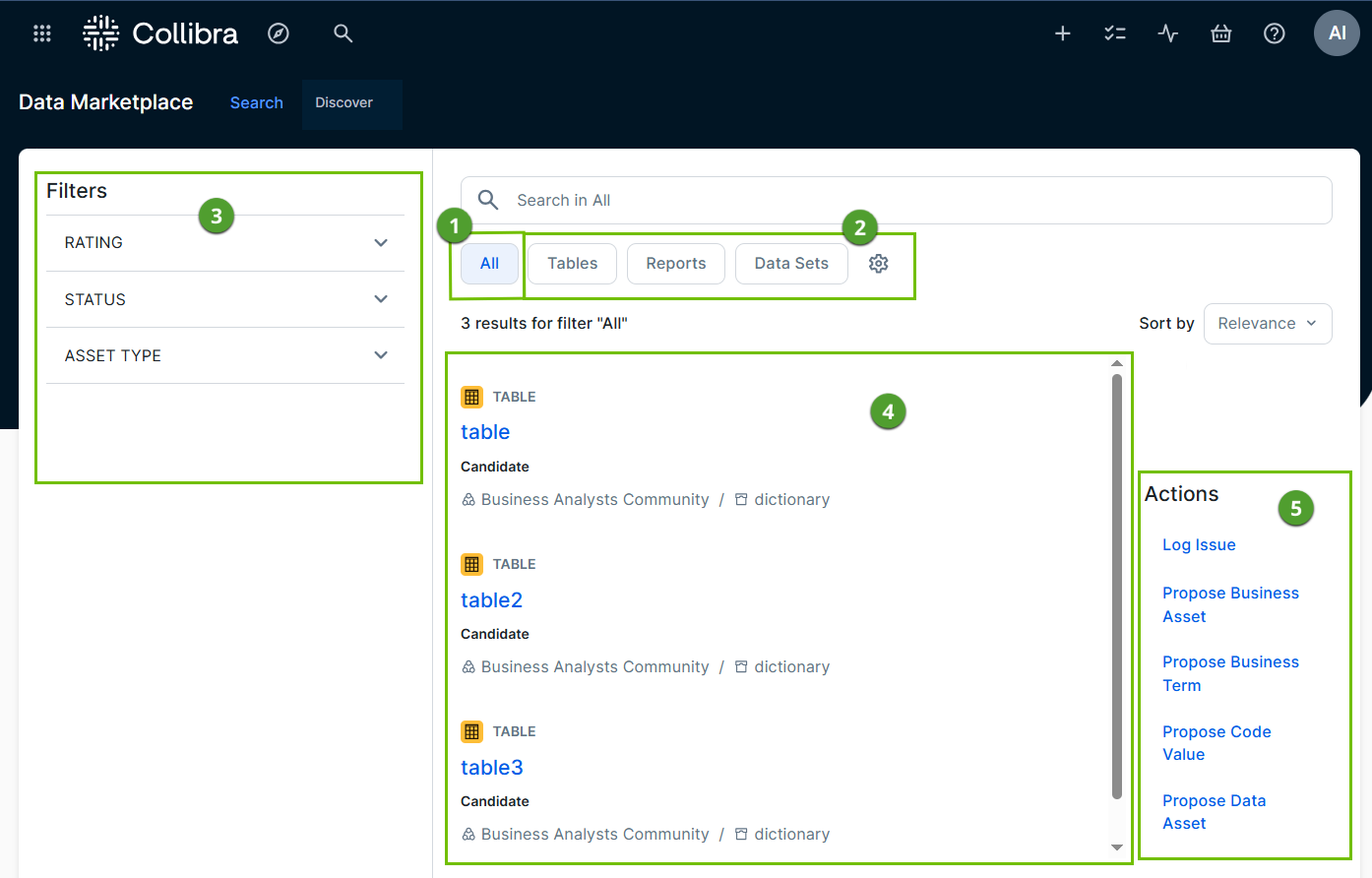 - In the Data Marketplace landing page, you can configure the introduction text (1), the quick links (2), the links to preconfigured filters (3), whether discovery data must be available (4), and the actions (5).