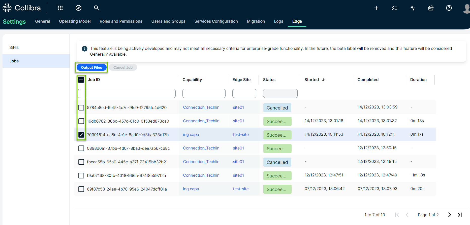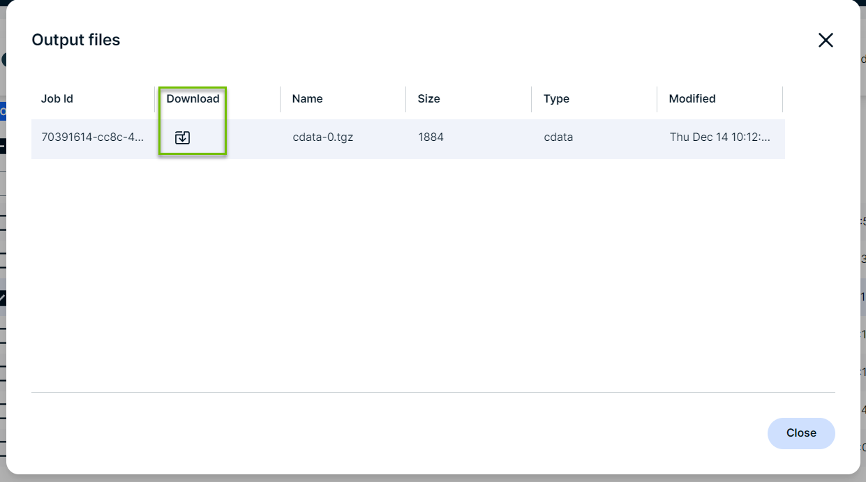 You can download the output file of commercial JDBC jobs. These files contain logs that help the Collibra Support Team troubleshoot job failures. There are two ways you can download these log files: