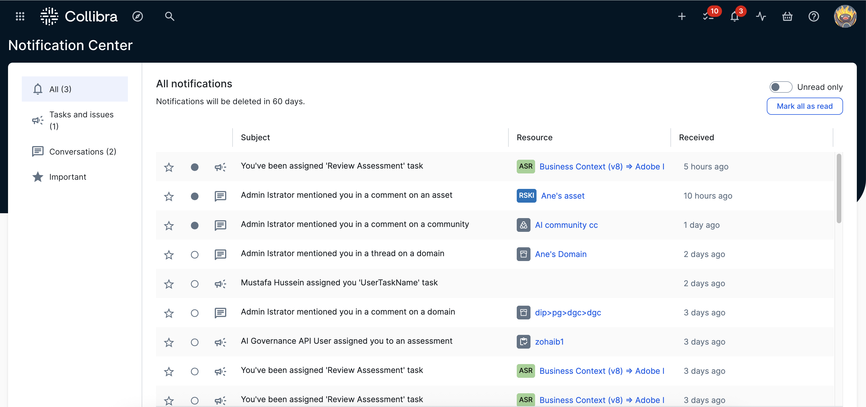 All of your Collibra notifications in the last 60 days. |