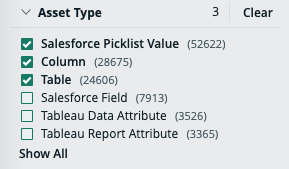 To show search results that are of the asset types you select (for example, Column and Table). This filter is applicable if you selected Assets in the Category filter. |