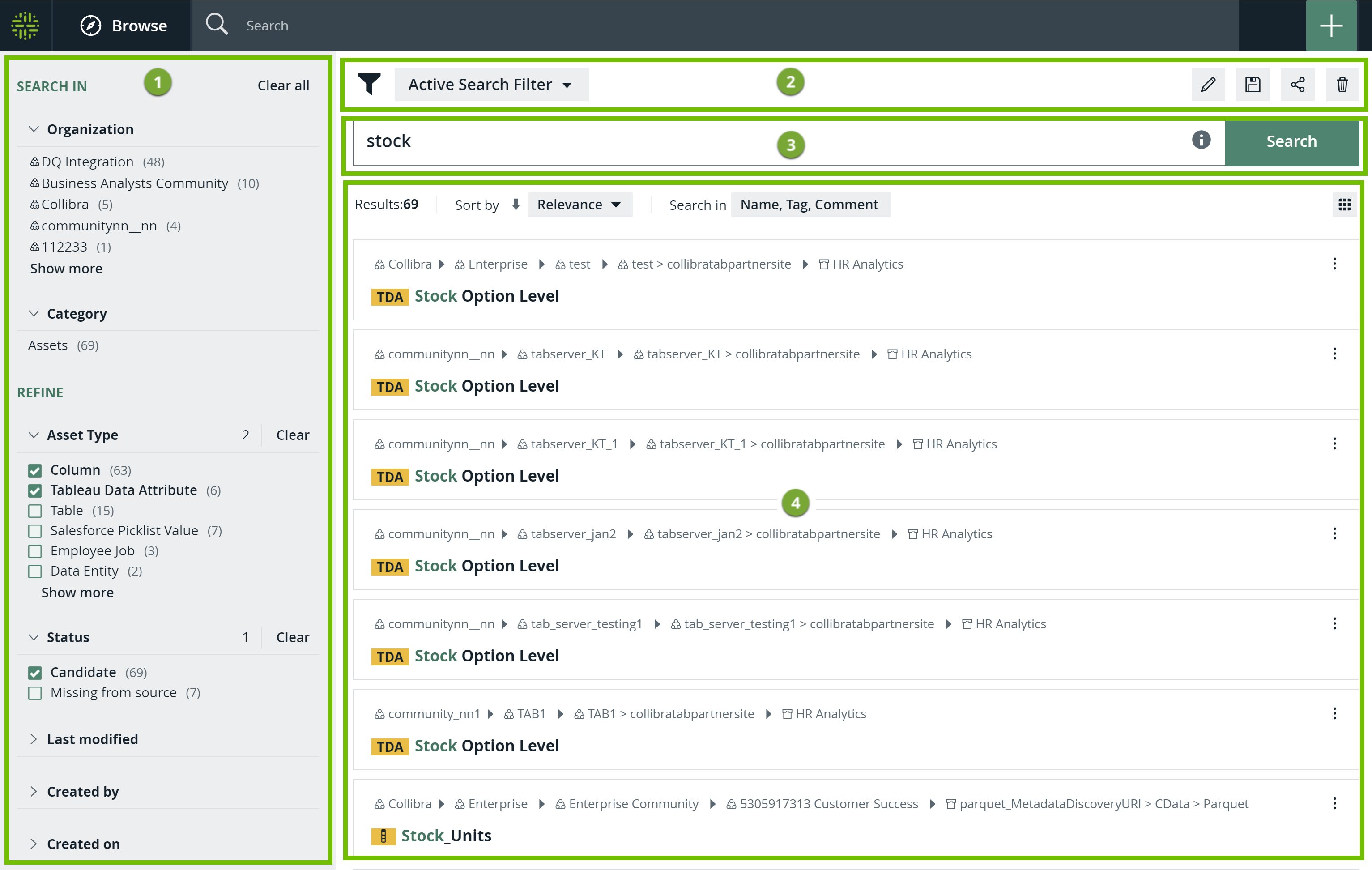 Results that match your search. The fields shown in the search results depend on the search result field configuration. If the text in a field is long, the text is trimmed when shown in a search result. Additionally, in the definition field in a search result, only a portion of the text is shown, including the part that matches your searched text. To open an asset in a new tab or to see the workflows available for an asset, hover your pointer over the asset in the search results, and then click |