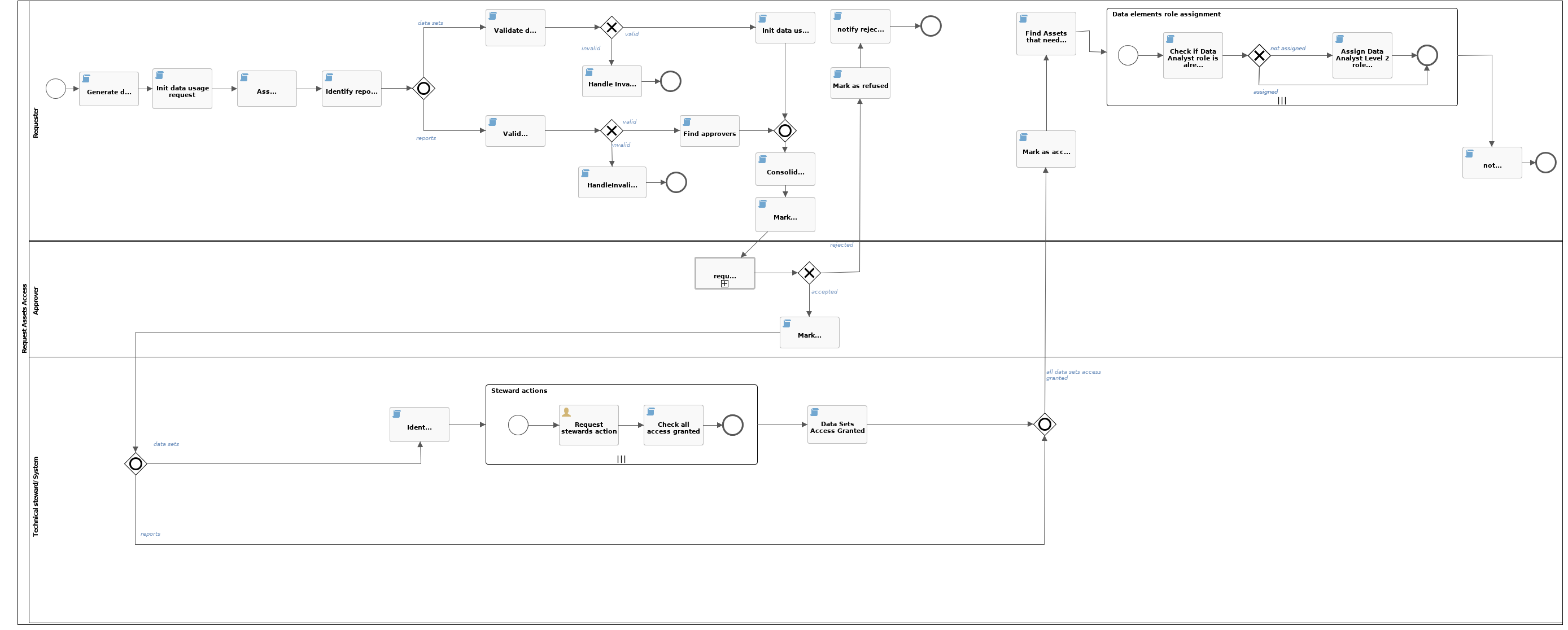 The workflow calculates the name of the asset by combining the creation date with a sequential number for that day, for example 2019-09-30 #1 and sets the asset characteristics according to the data submitted through the start form. The user who started the workflow receives the Requester role. The user with an Owner role approves the request for each data set and the Owner or Technical Steward provides access to the data set elements. For information on the workflow itself, go to the Collibra Developer Portal. |