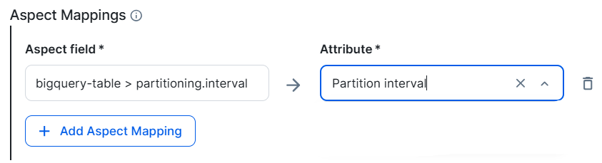 Aspect mapping is supported for Schema, Table, Database View, and Column assets, including partition columns. To map an aspect, enter the Google Dataplex aspect in Aspect field and the corresponding Collibra attribute in the Attribute field.