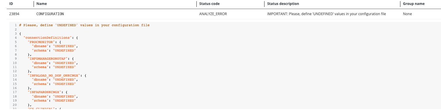 The connections lacking definitions are listed when you expand the CONFIGURATION analyze error. To resolve this issue, take any of the following actions: