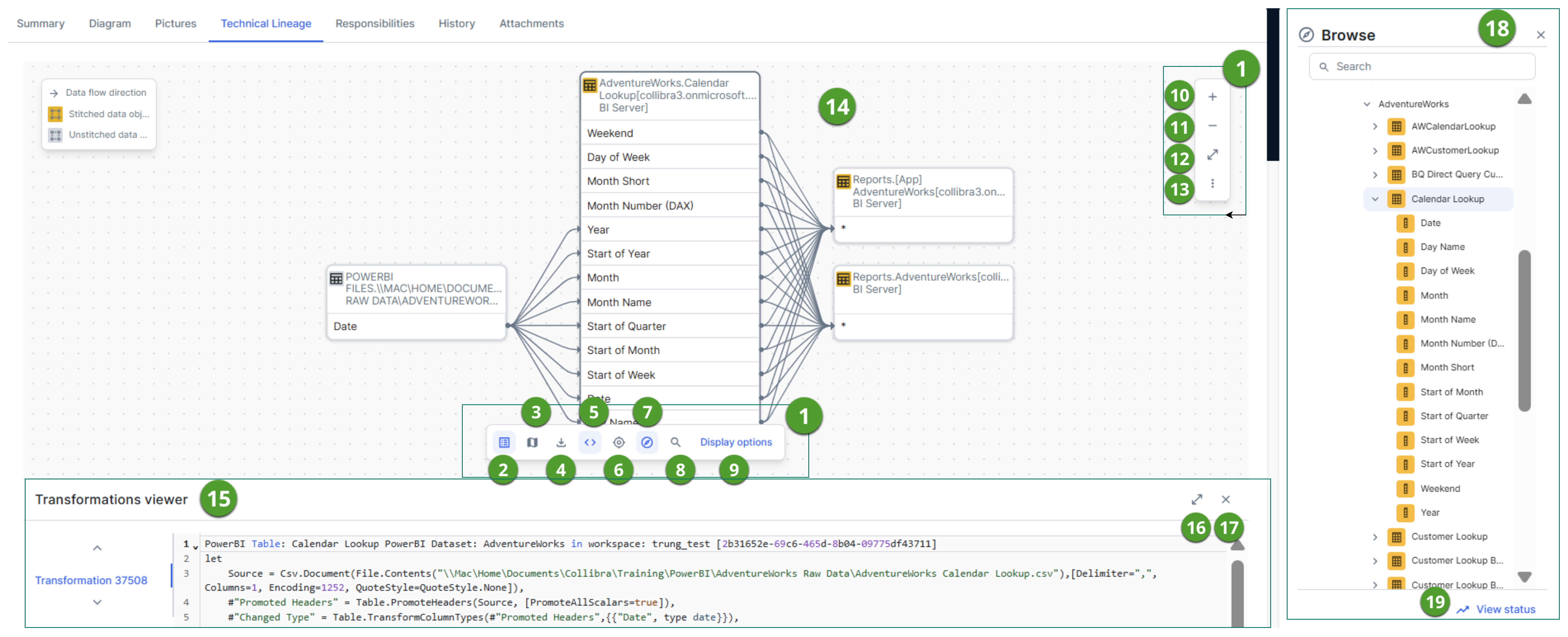 Tab panes that contain useful tools to browse through your technical lineage or determine which content is visualized in the technical lineage. |