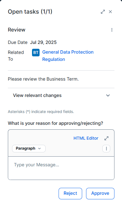 The subject matter experts receive a task to either approve or reject the changes made to the asset.