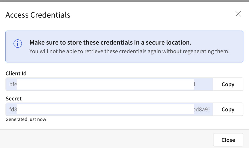 - Copy and paste the Client ID and Secret in a secure location. They will not be visible again.