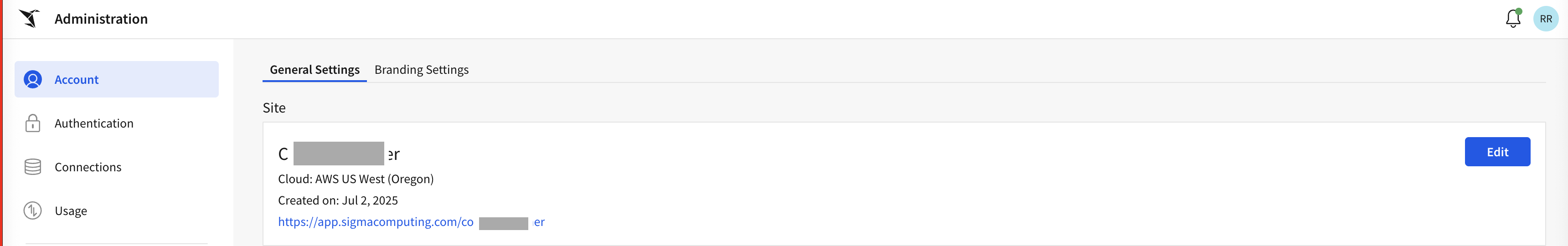 Yes Tenant URL The tenant-specific URL, for example https://app.sigmacomputing.com/<your-tenant> How to find the Tenant URL- Log in to your Sigma instance.