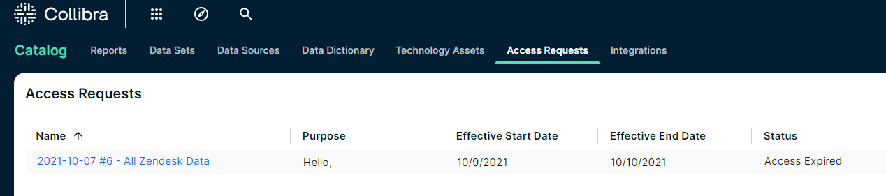 If you have requested access to one or more assets, the Access Requests page allows you to view the status of your requests. When you request access: