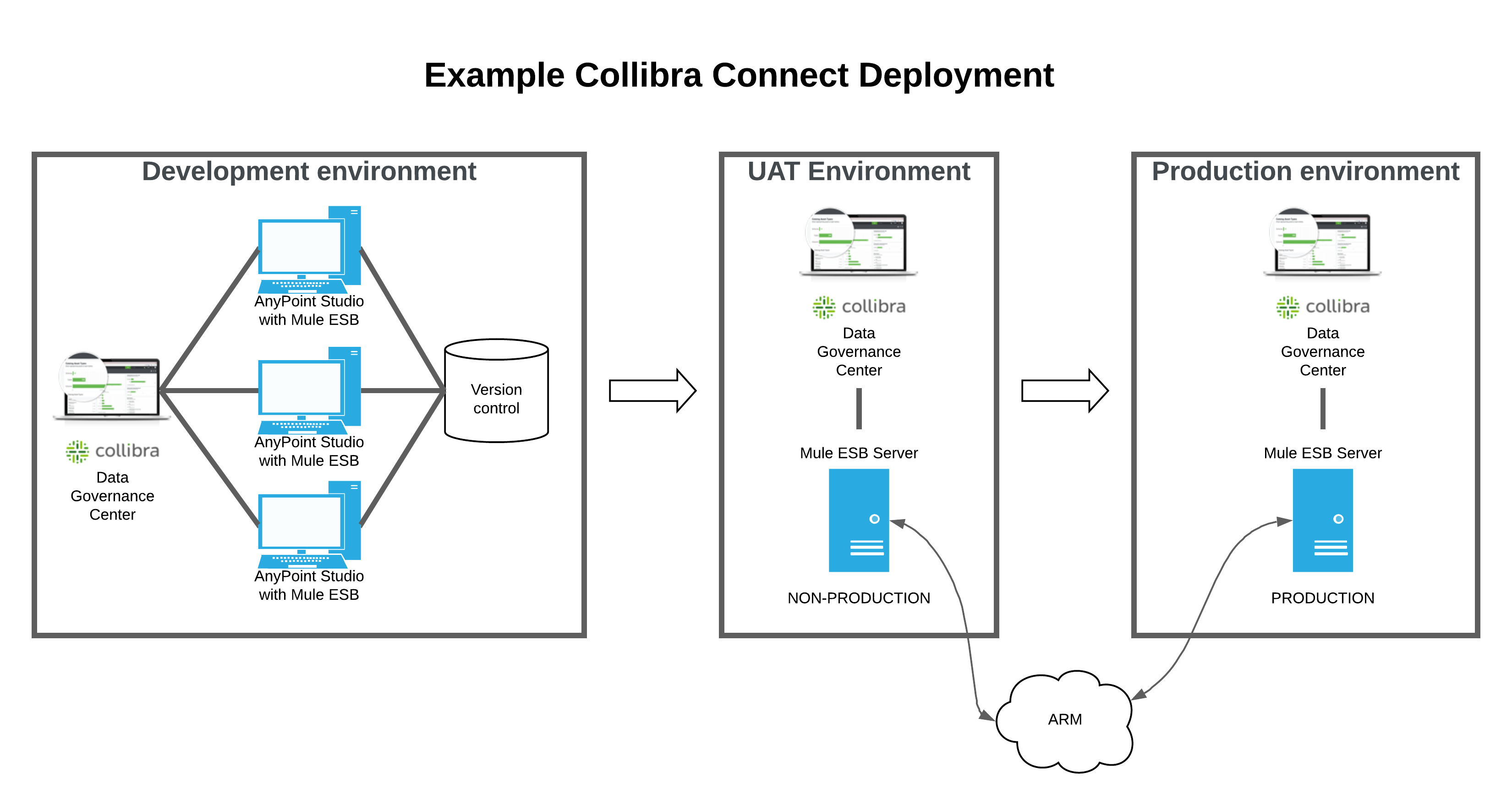 The diagram depicts a sample deployment environment for Collibra Connect with three tiers: a development, a testing and a production environment.