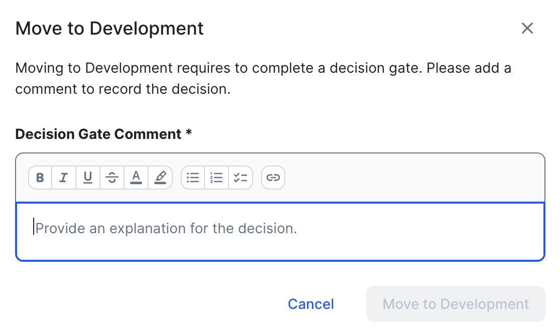 Decision gates are triggered when you use the Move to <stage> button in the Lifecycle tracker, to advance or revert the lifecycle stage of an asset. The Move to <stage> dialog box prompts you to describe the decisions and justification for advancing or reverting the stage of the asset, for example stakeholder decisions, recommendations from Legal, or committee meeting minutes.