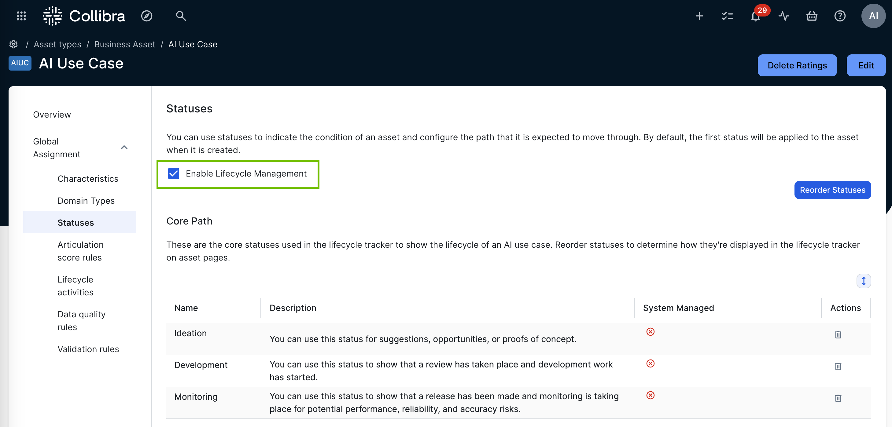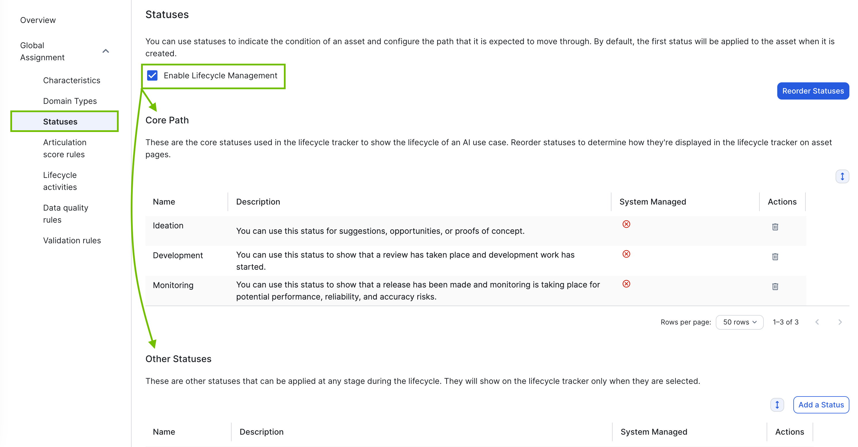 The asset type overview page opens. - In the tab pane, expand the Global Assignment tab (or the tab of the relevant assignment), and then click Statuses.Note If only the Global Assignment tab is shown, it means no one in your organization has added another assignment. In this case, use the Global Assignment. For more information on assignments and scopes, go to Create scoped assignments for the AI Governance asset types.The Statuses page opens.