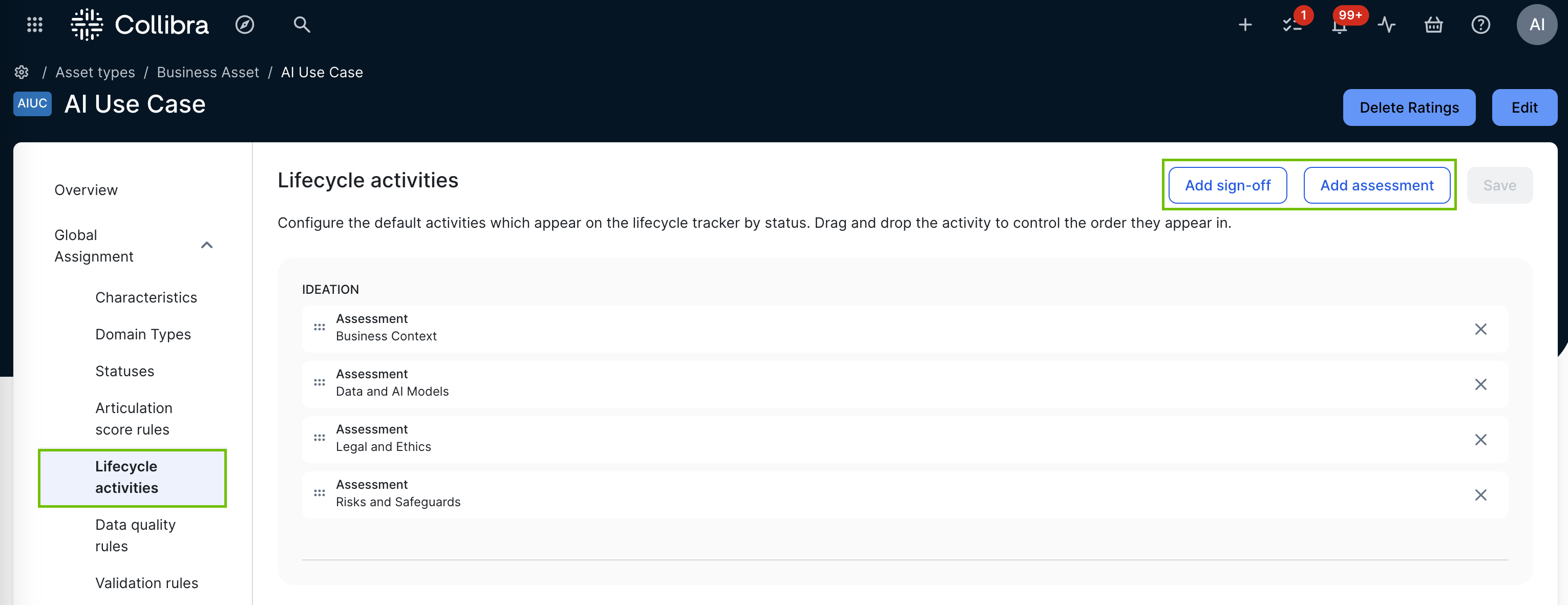 In addition to configuring lifecycle activities in the global assignment, you can also manually add assessment types, decisions, and sign-off activities to the Lifecycle tracker.