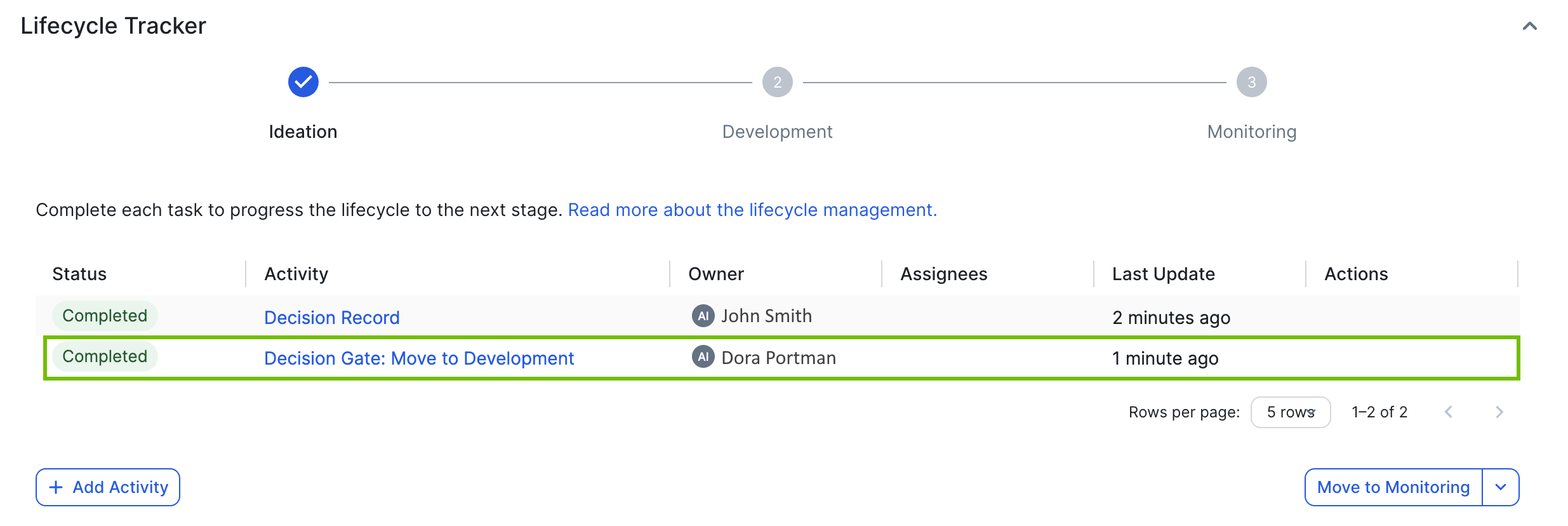 The information you provide is recorded as a decision gate and added in the Lifecycle tracker with the status Completed.