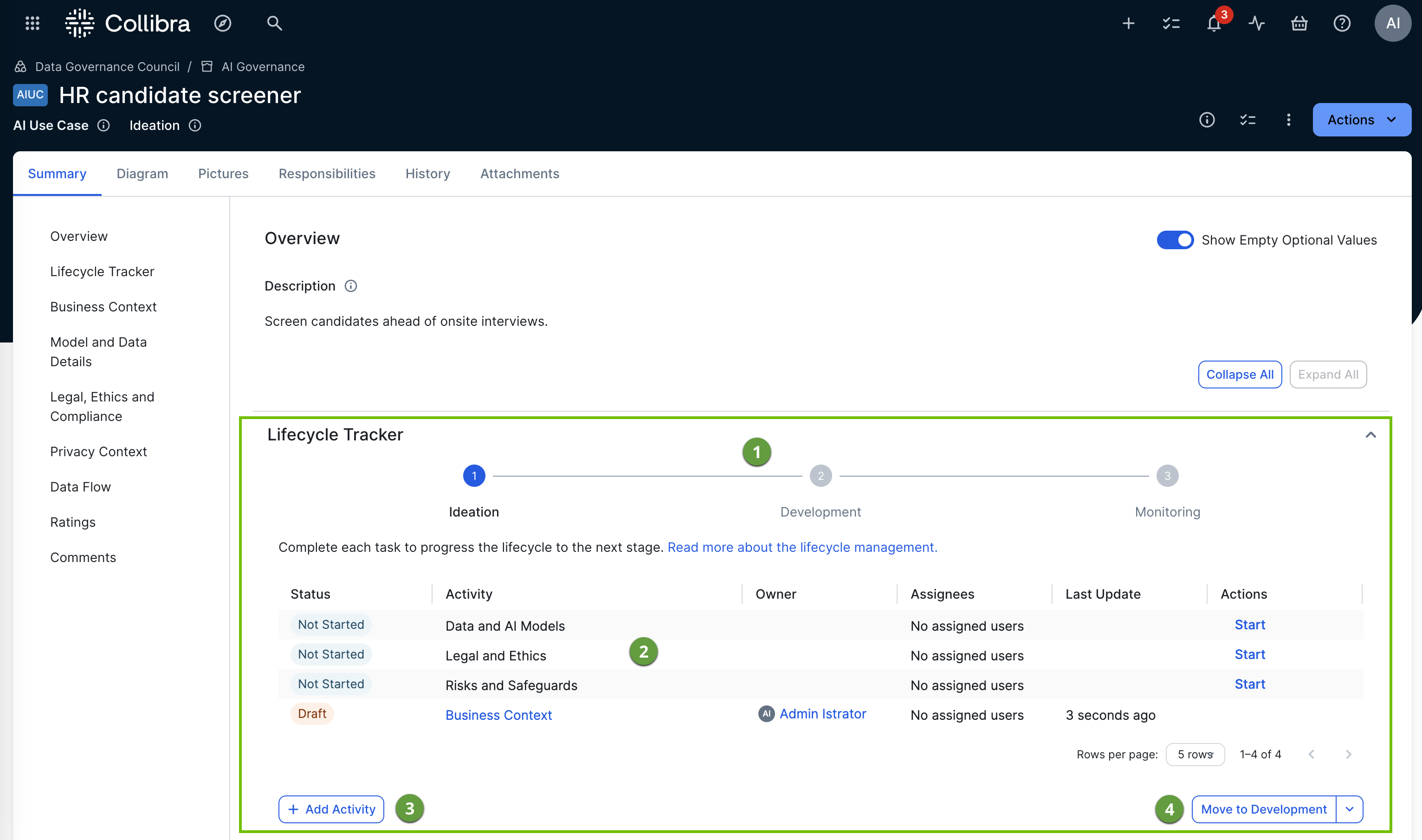 Shows the lifecycle stages of the asset. For example, the default lifecycle of an AI use case is: Ideation, Development, and Monitoring. The lifecycle stages that are shown in the Stage Stepper are determined by the asset statuses configured in the Core path section of the Lifecycle activities tab of the asset's global assignment. For complete information, go to Configure the lifecycle stages of AI Governance assets. Tip You can click the tabs in the Stage Stepper to view the activities that were completed in a previous lifecycle stage, or those awaiting action in an advanced stage. Doing so does not change the lifecycle stage of the asset. |