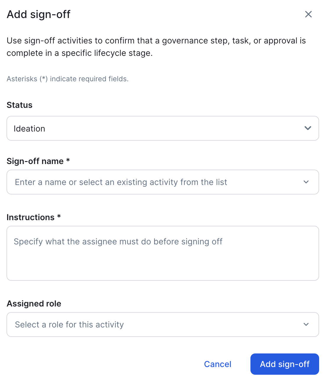 Tip The lifecycle stages that head the sections shown on this page (for example, Ideation, Development, and Monitoring) reflect the statuses that are configured for the asset type. The order cannot be changed on this page. To configure the lifecycle stages through which you want your assets to evolve, go to Configure the lifecycle stages of AI Governance assets. - Click Add sign-off.