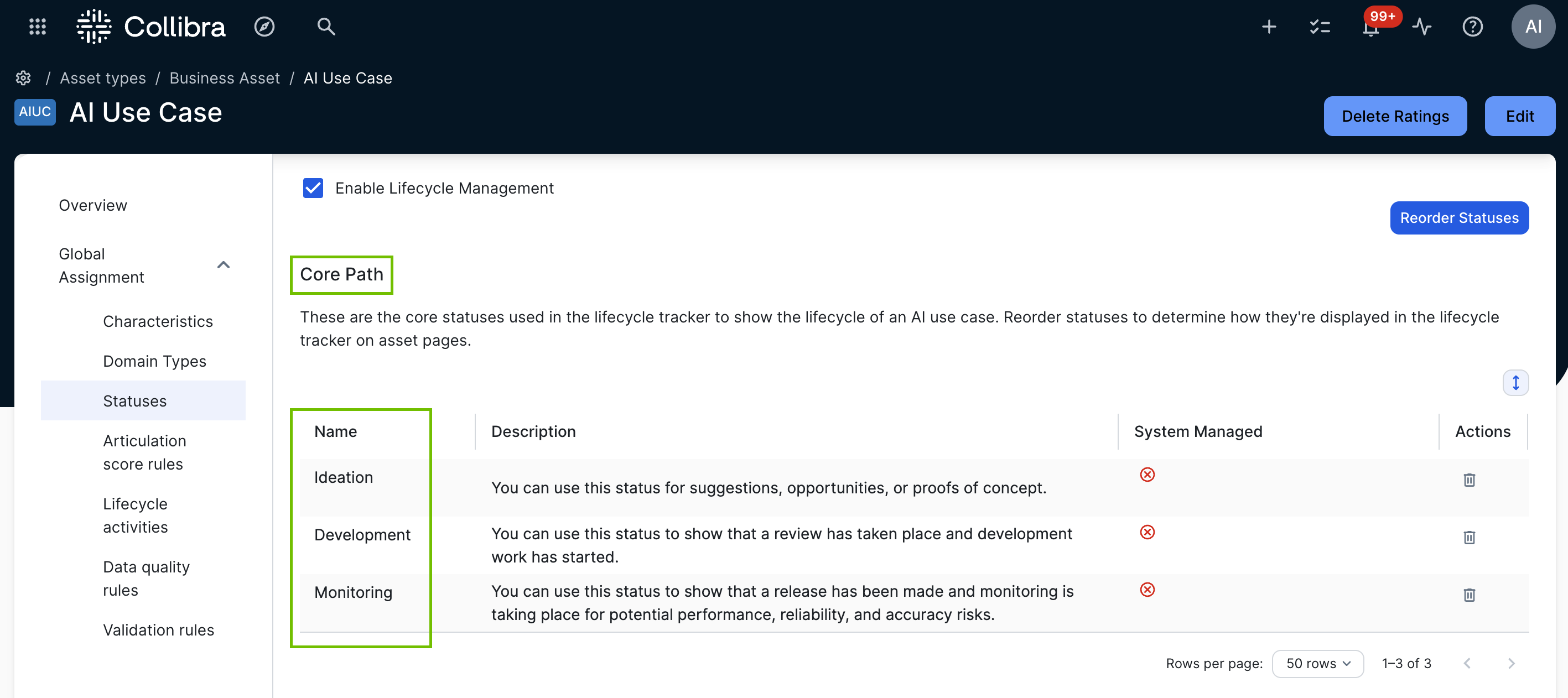 The lifecycle stages that are available here depend on the list of Core Path asset statuses in the Statuses tab of the global assignment of the asset type.