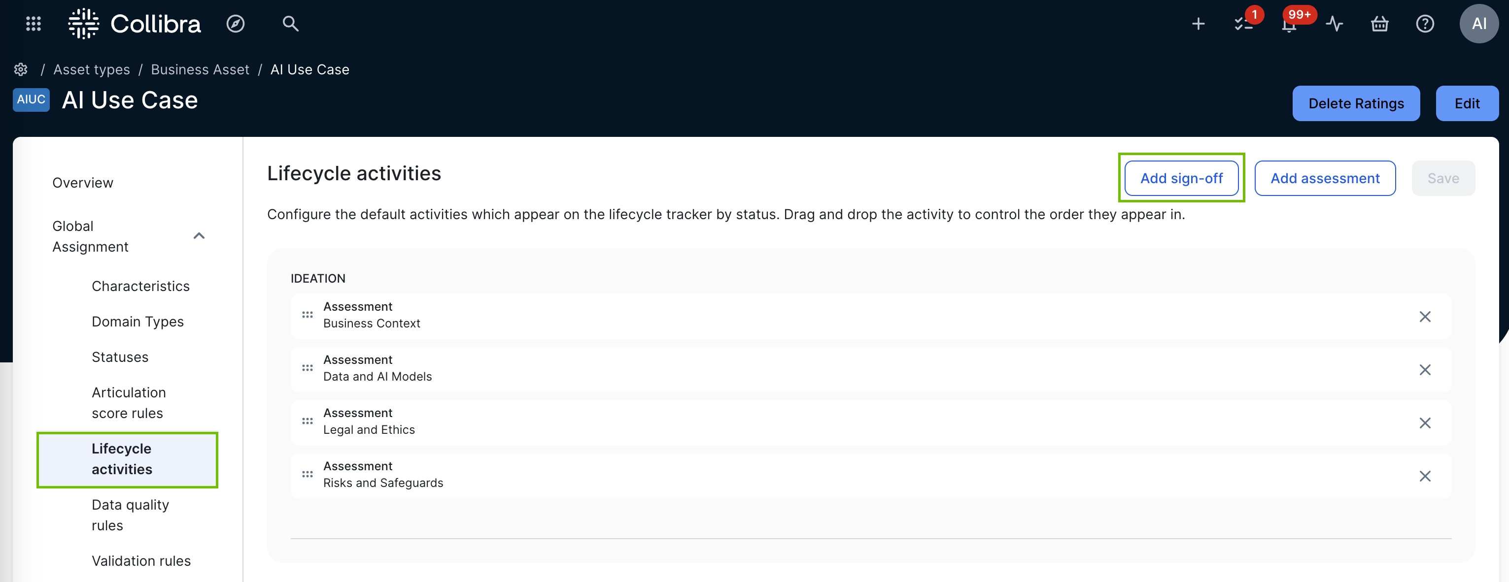 The asset type overview page opens. - In the tab pane, expand the Global Assignment tab or the tab of the relevant assignment, and then click Lifecycle activities.Note If only the Global Assignment tab is shown, it means no one in your organization has added another assignment. In this case, use the Global Assignment. For more information on assignments and scopes, go to Create scoped assignments for the AI Governance asset types.The Lifecycle Activities page opens.