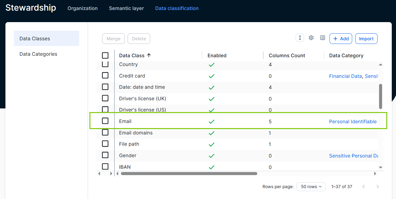 If you have defined Data Category assets in CPSH, you can link them to one or more data classes. As a result, if a column is classified with a data class that is linked to a data category, we'll automatically create a relation between the column and the data category. This way, through Data Classification, you can create a list of the columns that contain specific data categories such as PII.