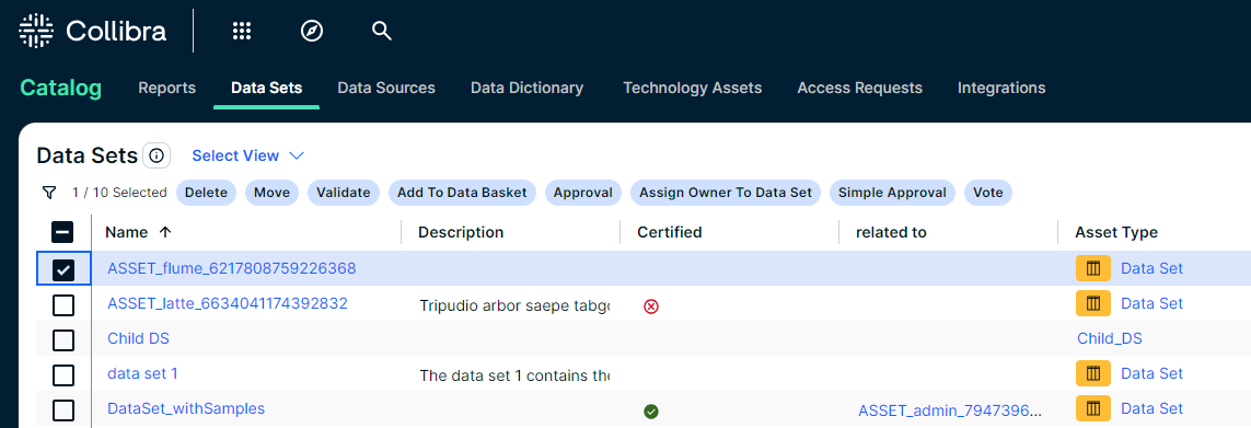 The Data Sets overview page contains the data sets that are available in Collibra Platform Self-Hosted. You can view the data sets in tile display mode or table display mode.