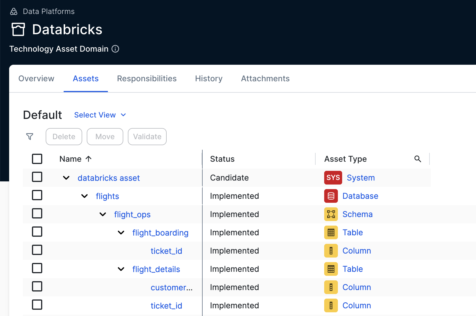 To move all resulting assets to another location permanently, select another System asset in the current synchronization configuration or create a new capability with a synchronization configuration that integrates the data in the new location.ExampleYou created System asset A in Domain A and synchronized Databricks. As a result, Table A and Column A have been added to Domain A. Then, you manually moved Table A and column A to Domain B. When you synchronize Databricks again, Table A and Column A will move back to Domain A.