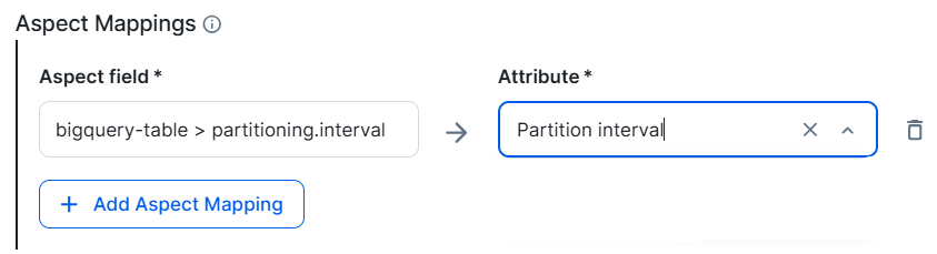 Aspect mapping is supported for Schema, Table, Database View, and Column assets, including partition columns. To map an aspect, enter the Google Dataplex aspect in Aspect field and the corresponding CPSH attribute in the Attribute field.