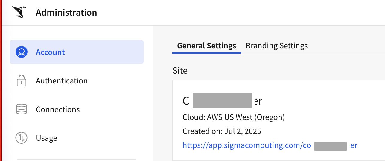 Tenant URL The tenant-specific URL, for example https://app.sigmacomputing.com/<your-tenant>How to find the Tenant URL- Log in to your Sigma instance.