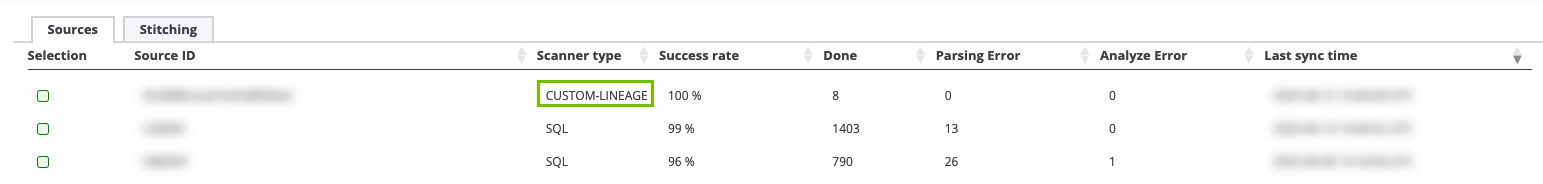 Sort by each column | The sorting icons that you can use to sort by each column in ascending or descending order. These columns include Scanner Type, Success Rate, Done, Parsing Errors, Analyze Errors, and Last Sync Time. |