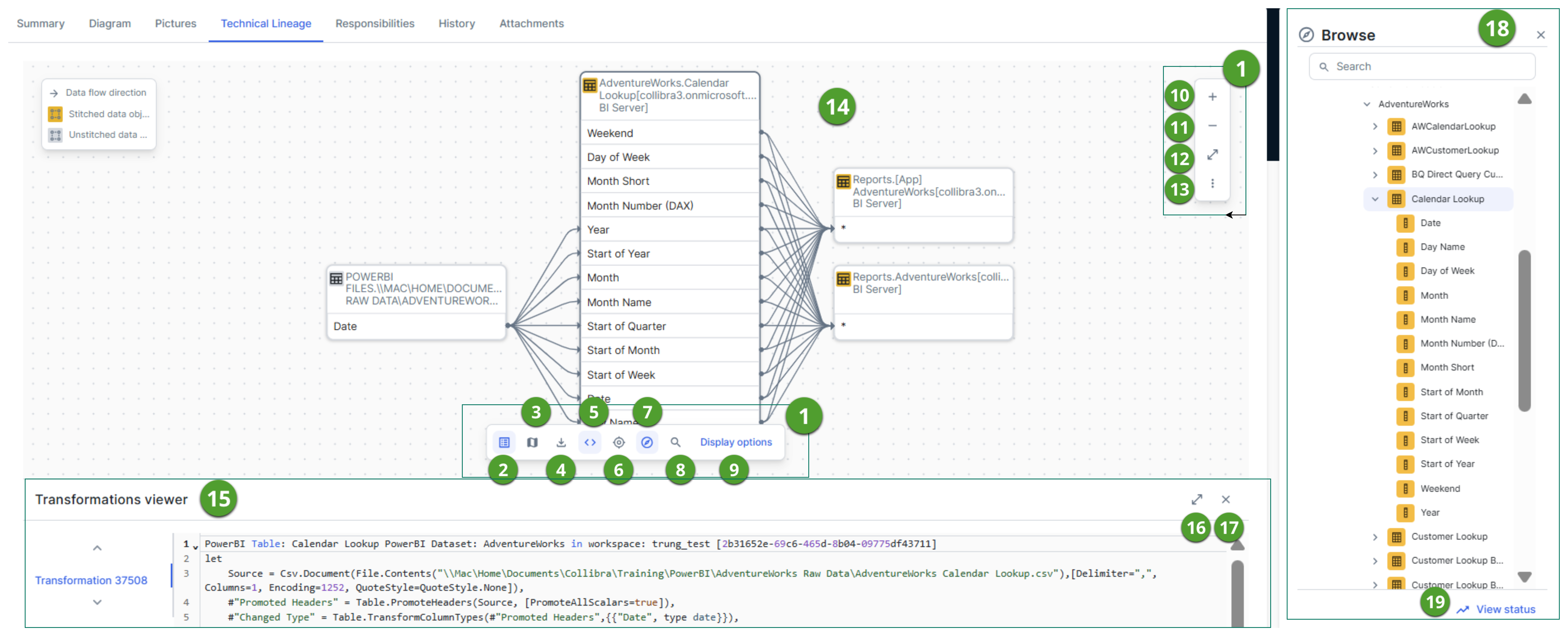 Tab panes that contain useful tools to browse through your technical lineage or determine which content is visualized in the technical lineage. |