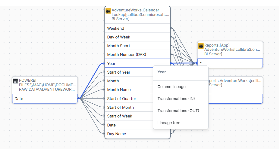 The actual visualization of the traceability of the current data object, according to your selection in the Browse tab pane. If you select a specific column in a table with multiple columns, you can right-click the column and hover over Collapsed attributes to show all other columns or only the selected columns in the same table.